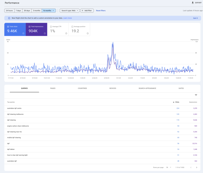 Some queries, such as dpf cleaning melbourne and engine carbon clean melbourne, are performing well in terms of click-through, which could be a focus for optimizing content.