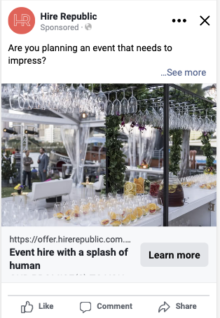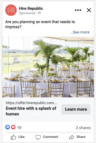 Google Ads complemented this by capturing bottom-funnel demand and converting searches into leads at scale. Over the period, campaigns generated 66 conversions at an average CPL of $73.86 from 3,248 clicks at just $1.50 CPC. Furniture hire proved the strongest performer with 40 conversions at $63 CPL, followed by catering hire at $72 CPL, while brand terms delivered efficient results at $39 CPL. Together, the campaigns confirmed that Hire Republic’s strongest opportunities for growth lie in furniture and catering hire, with further optimisation able to reduce CPL while maintaining the brand’s premium presence.