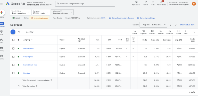 Between August 2024 and March 2025, Google Ads delivered a consistent stream of high-intent leads for Hire Republic. With 66 total conversions at an average cost per conversion of $73.86, the campaigns proved effective in capturing qualified demand across event hire categories.