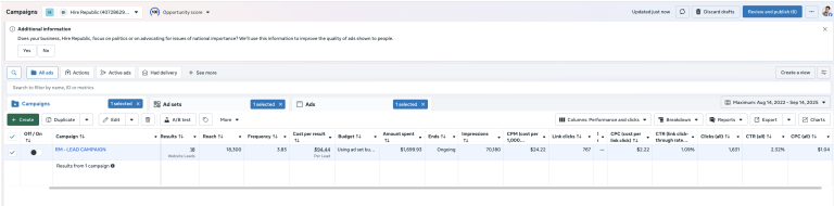 The campaign successfully built awareness, generated qualified leads, and reinforced Hire Republic’s brand positioning. The focus on staying “on brand” resulted in a higher CPL, but it also strengthened perception with the right audience. Moving forward, testing new audiences and creative variations can help reduce CPL without compromising brand integrity.